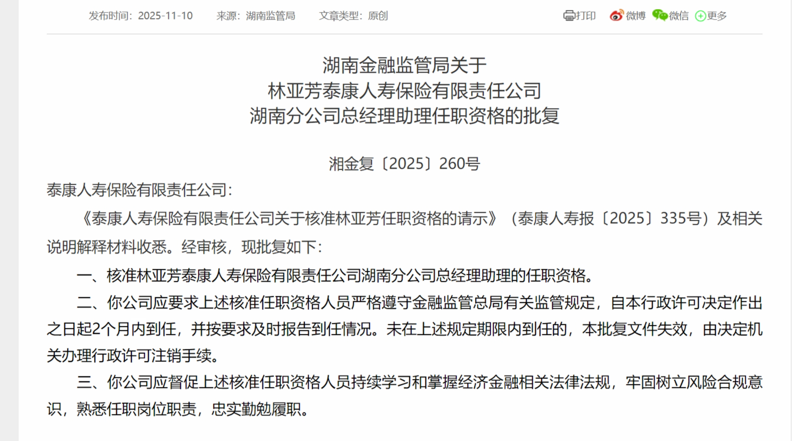 11月10日北京股票配资公司,湖南金融监管局发布关于林亚芳泰康人寿保险有限责任公司湖南分公司总经理助理任职资格的批复,核准林亚芳泰康人寿保险有限责任公司湖南分公司总经理助理的任职资格。
