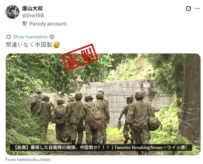 4月21日,tweetsoku.news发布了内容为“【图片】自卫队那枚哑火炮弹是中国制造的吗?!”的帖文,并配上了一张士兵在野外步行的图片。除了图片外,帖文并未给出更多可以佐证说法的文字信息或细节证据。